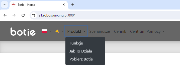 2. Po otwarciu strony domowej, wejdź w sekcję Produkt i z rozwijanego menu wybierz Pobierz Botie.