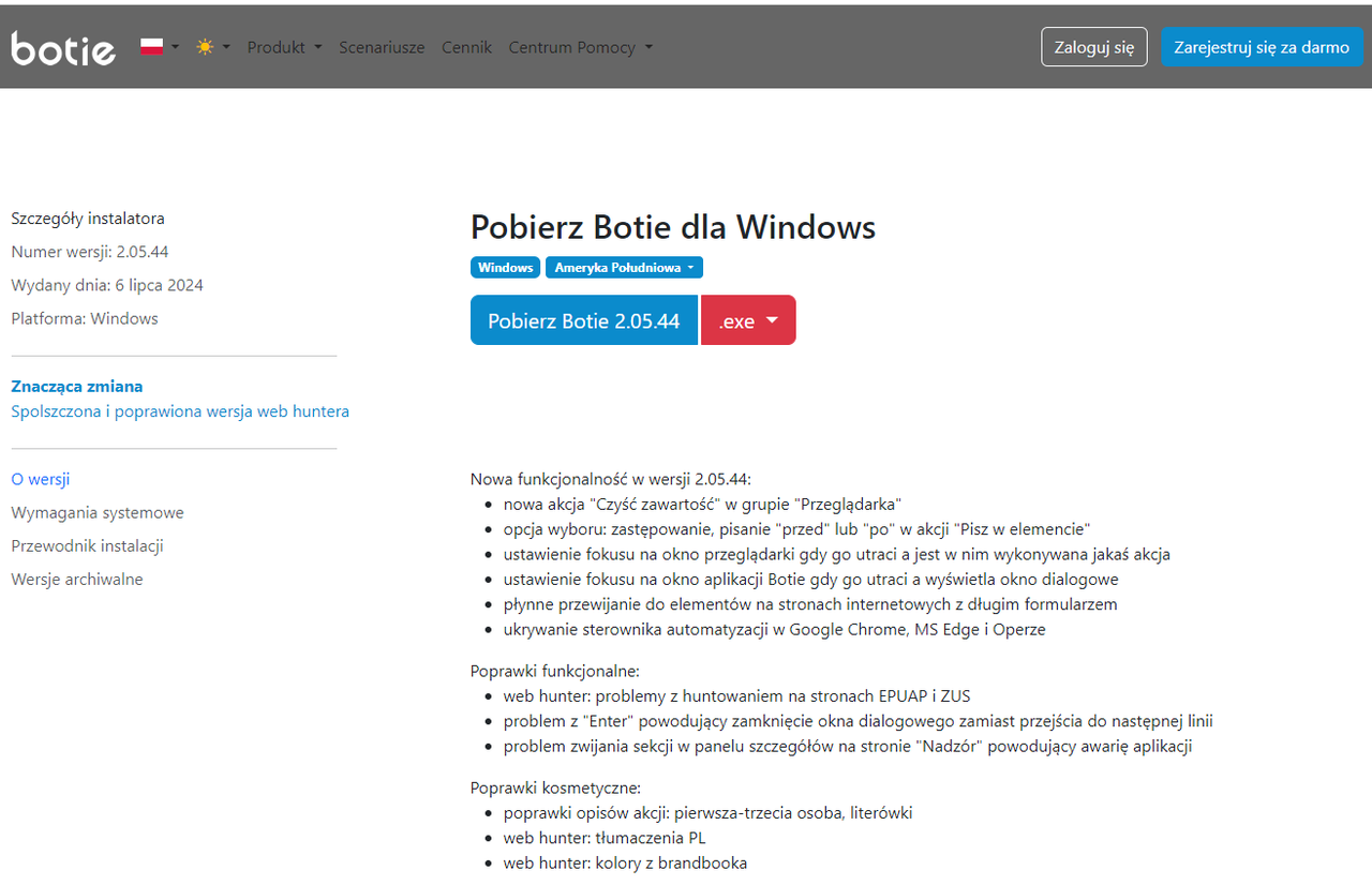 5. Naciśnij duży niebieski przycisk Pobierz Botie 2.05.44 (będzie to zawsze najnowsza wersja).