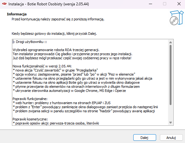 2. Po wyborze języka pokaże się okno informacyjne o nowościach w bieżącej wersji, które możesz przejść klikając Dalej.