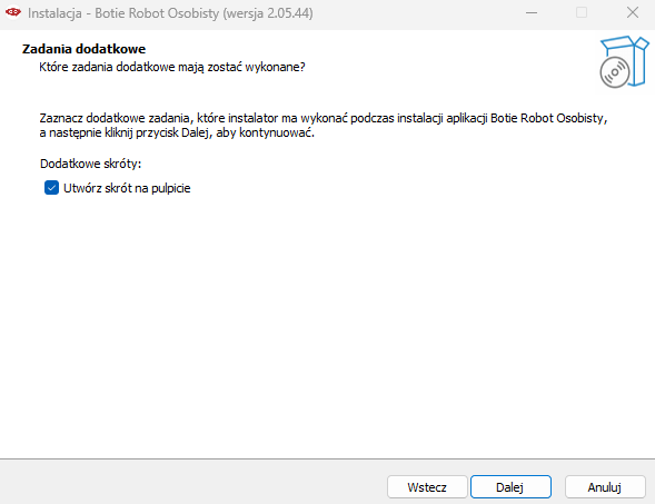 4. W następnym oknie Zadań dodatkowych do wyboru jest możliwość utworzenia skrótu do Botie na pulpicie użytkownika. Kliknij Dalej.